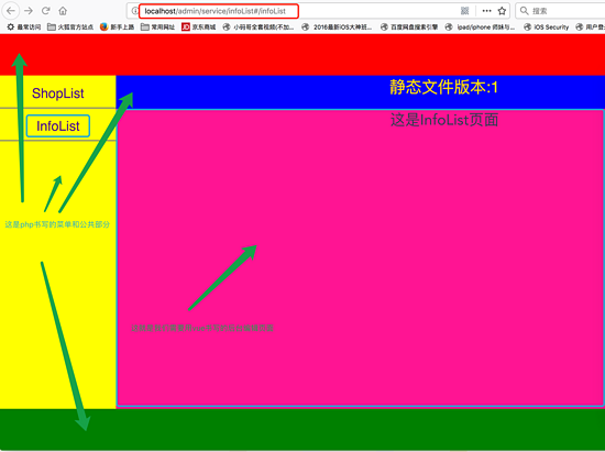 2.8 终端输入npm run build 在浏览器中打开 http://localhost/admin/service/infoList#/infoList 这时候的页面结构是这样的,vue单页和php页面完全解耦,书写后台管理系统的时候我们只要关注vue单页区域就可以了,页面跳转和单页配置在php代码中完成即可。