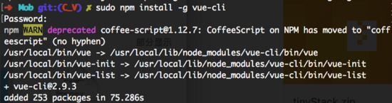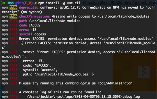 安装失败是因为权限不足,这时候使用sodo npm install -g vue-cli 进行管理员权限的安装即可,第一次安装需要输入管理员密码
