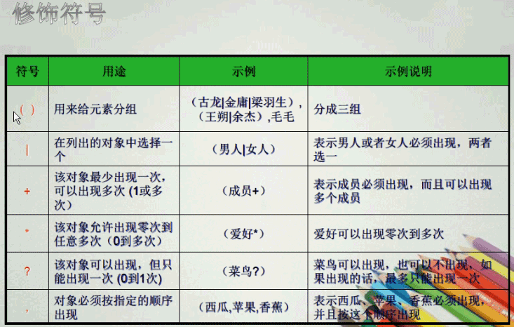这部分符号可以联系正则表达式的符号来记忆。重点内容