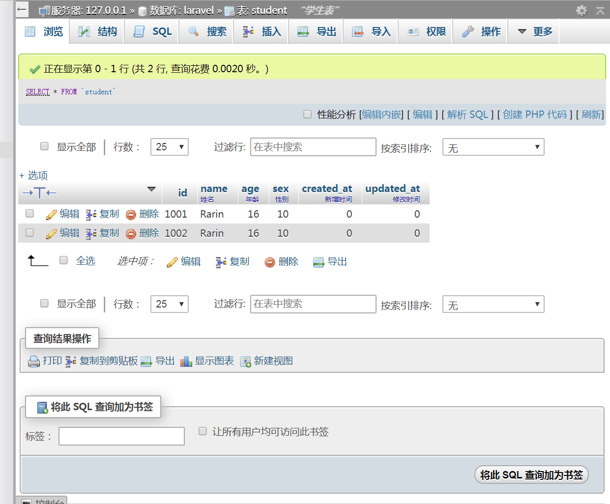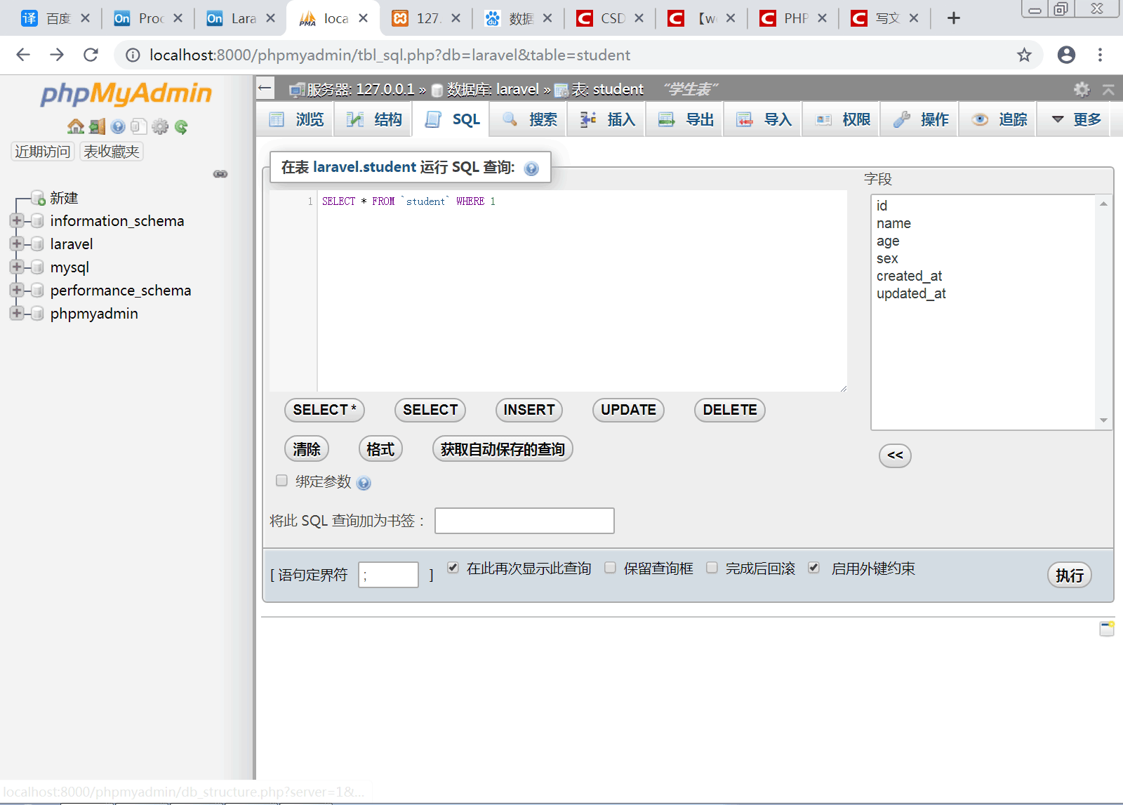 然后在laravel数据库下面添加一个数据表,并命名为student,然后点击sql