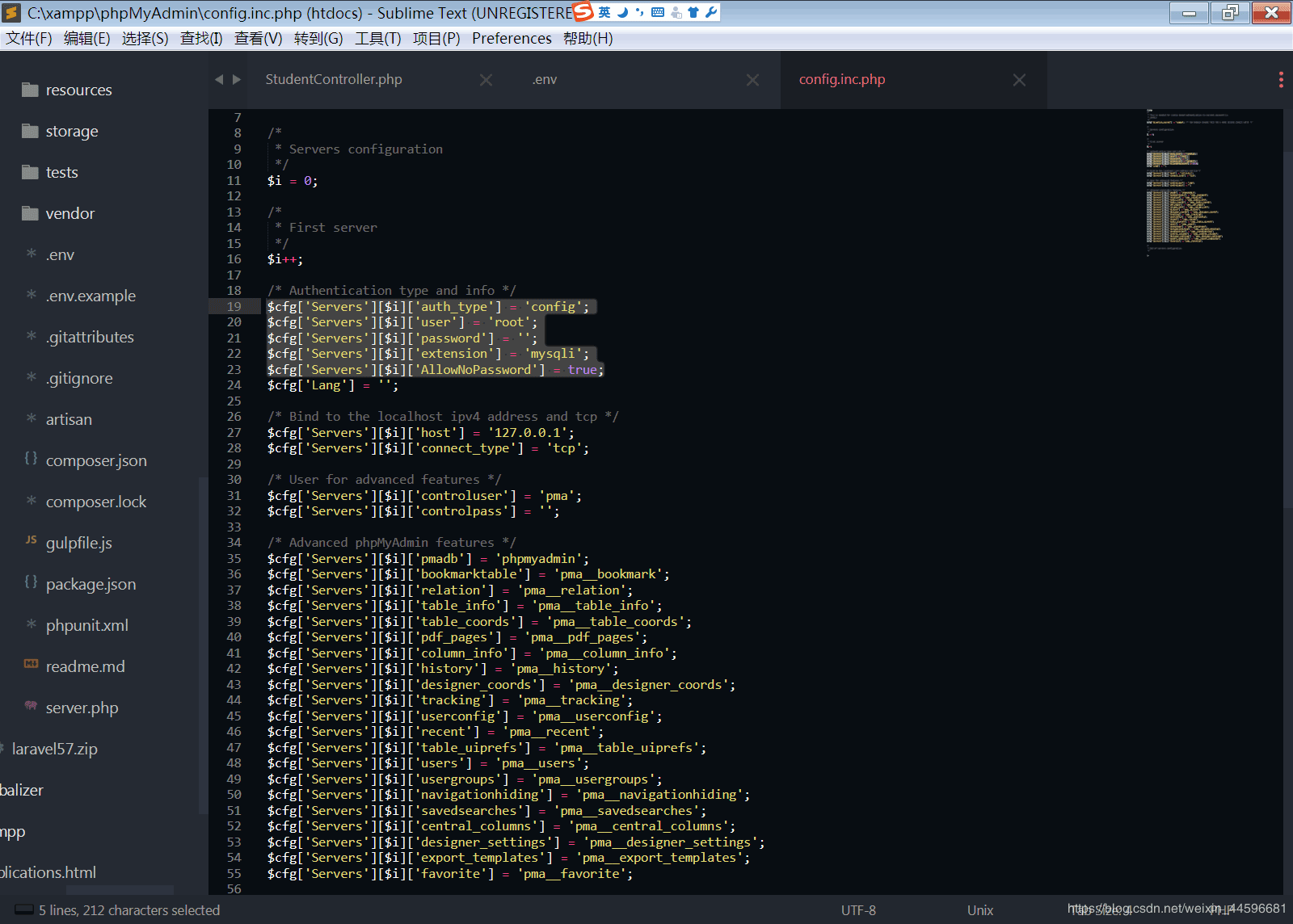 然后怎么看数据库账号和密码呢?很简单,打开我们的phpmyadmin文件,点击它的config.inc.php文件,然后即可查看他的账户和密码,如下图所示: