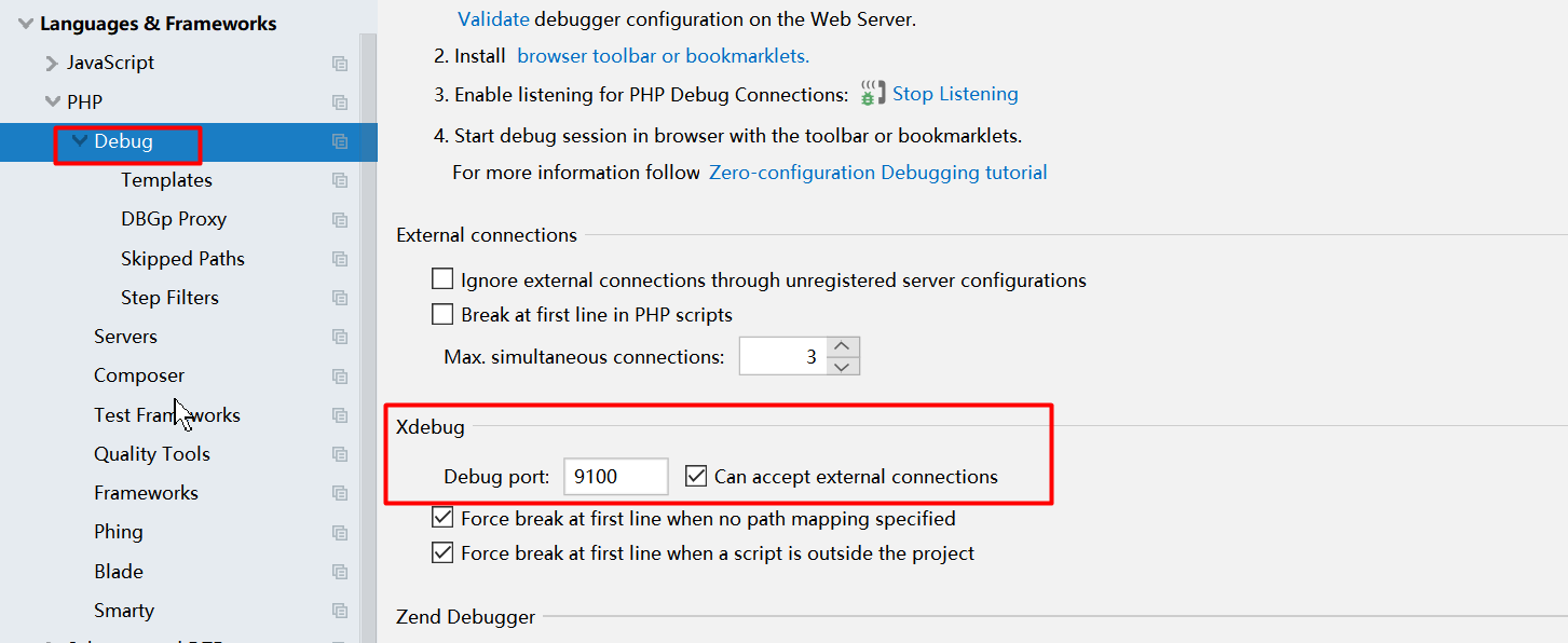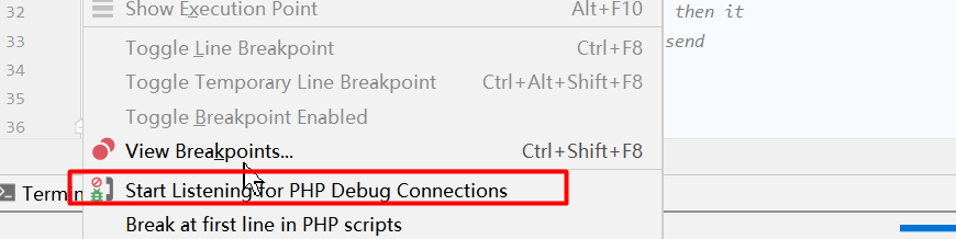 RUN->Start Listening for PHP debug connections->打断点->debug