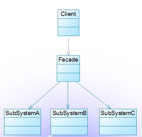 外观模式:为子系统中的一组接口提供一个一致的界面, Facade模式定义了一个高层接口,这个接口使得这一子系统更加容易使用。引入外观角色之后,用户只需要直接与外观角色交互,用户与子系统之间的复杂关系由外观角色来实现,从而降低了系统的耦合度。