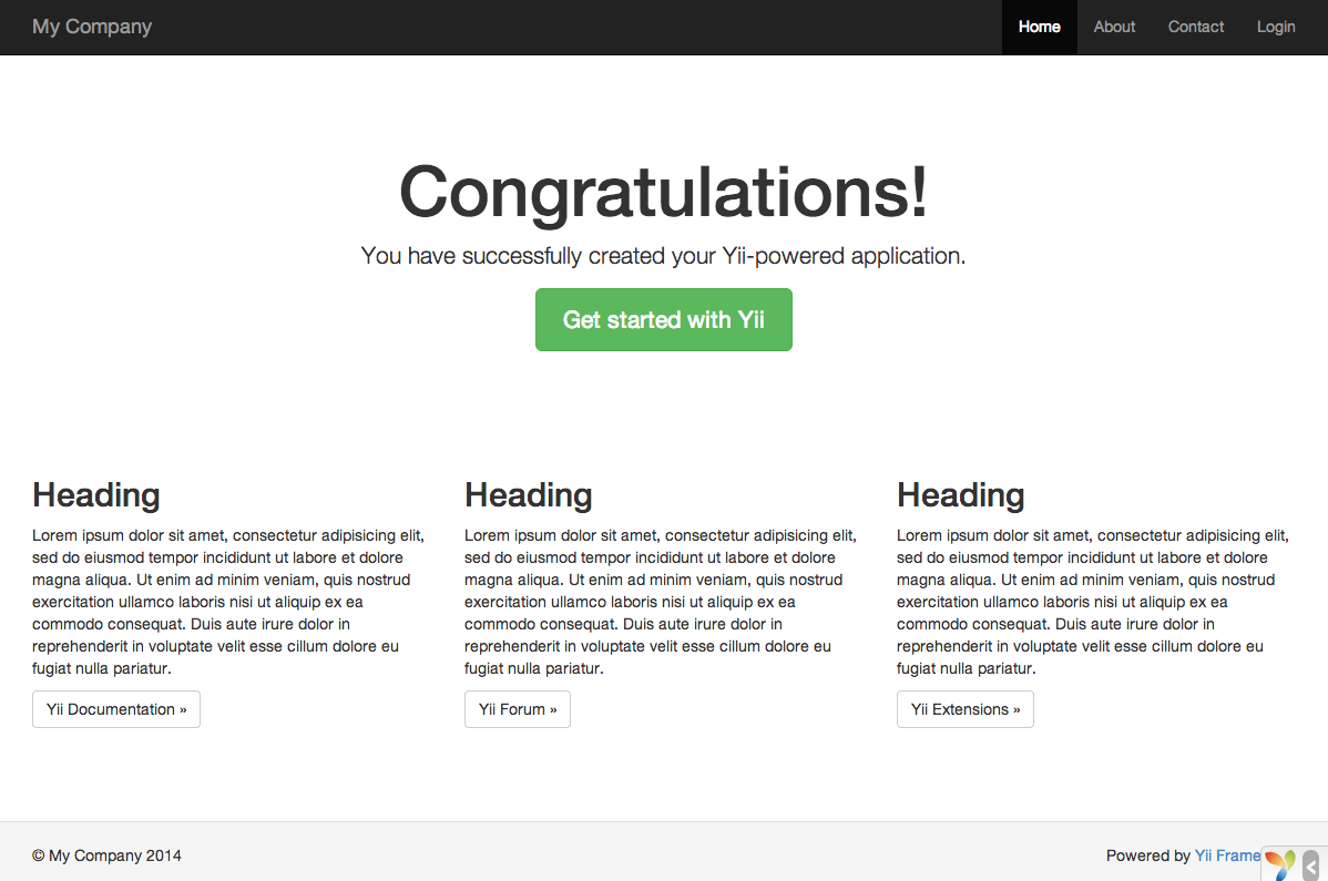 你应该可以在浏览器中看到如上所示的 “Congratulations!” 页面。如果没有, 请通过以下任意一种方式,检查当前 PHP 环境是否满足 Yii 最基本需求: