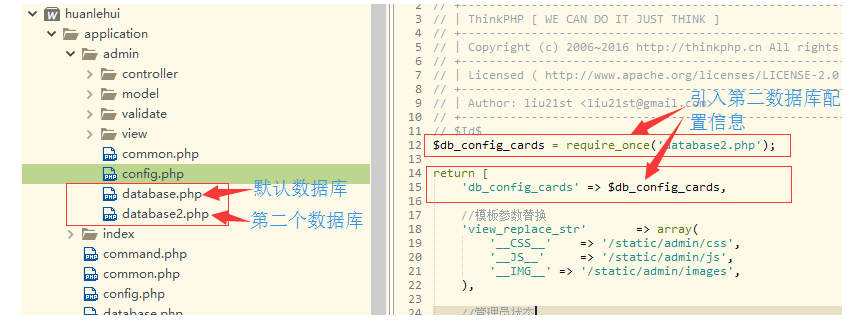 database.php是框架默认的数据库配置,里面写数据库1的信息,新建了个database2.php是放置数据库2的信息。