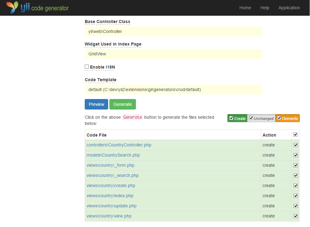 如果你之前创建过 controllers/CountryController.php 和 views/country/index.php 文件(在指南的使用数据库章节), 选中 “overwrite” 下的复选框覆写它们(之前的文件没能全部支持 CRUD)。