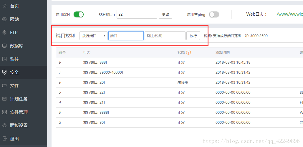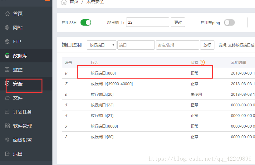 当我们进phpmyadmin的时候,端口默认为888,这时,我们就要检查宝塔面板和阿里云(我是在阿里云买的服务器。或腾讯云等)控制器里的安全组的888端口是否开放。