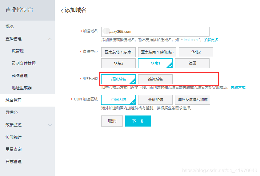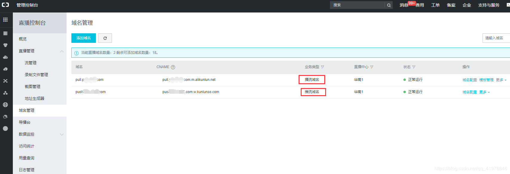 首先进入视频直播的控制台>>域名管理>>添加域名