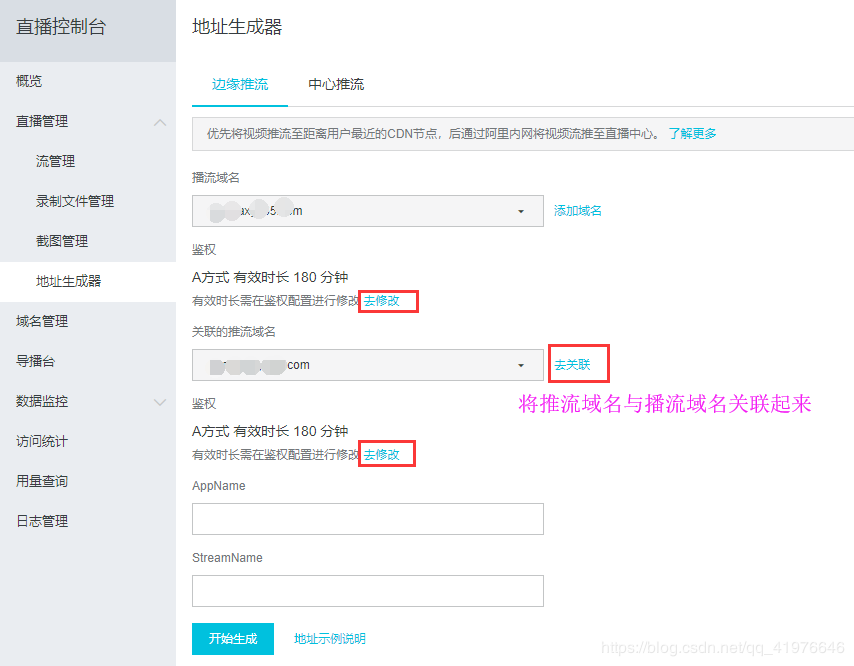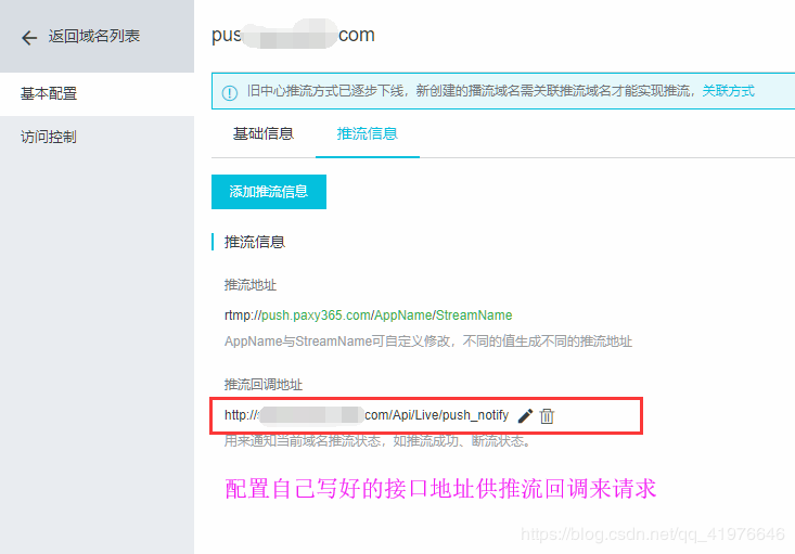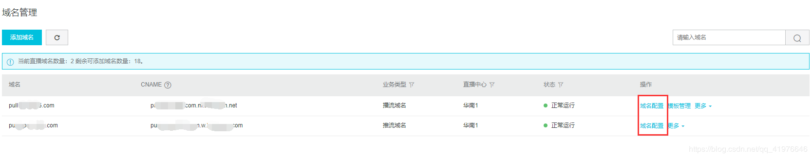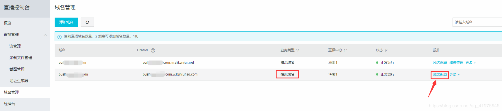 推流与播流的链接都是以一定的规则自己拼起来的,首先要在域名配置