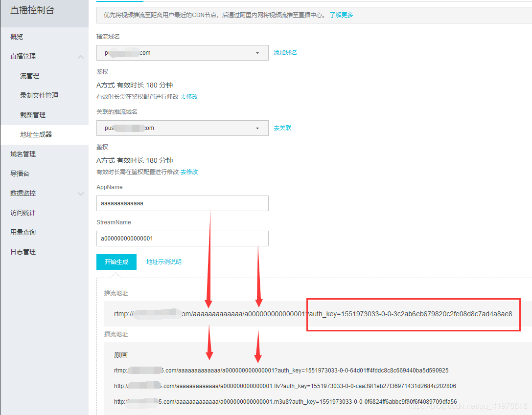 //------------------- 阿里云视频直播控制台 地址生成器 鉴权设置 -----------