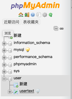 登陆myadmin后创建数据库user和表单usertext: