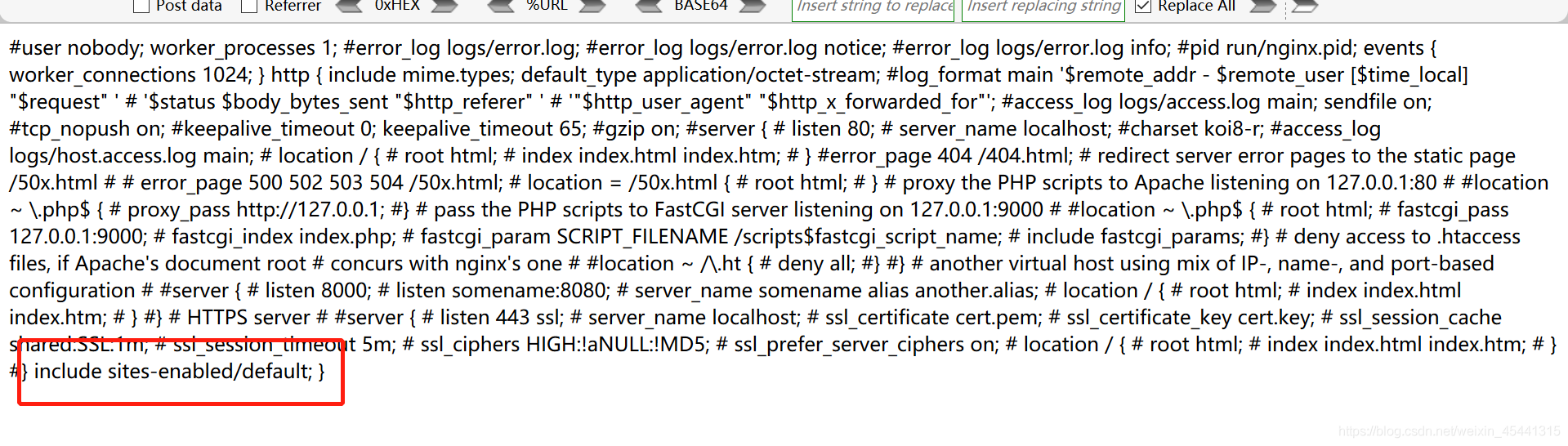 5、查看下服务器是nginx。找一下它的配置文件,根据信息读取配置文件, url: manages/admin.php?module=…/./…/./…/./etc/nginx/nginx.conf 获得关键文件sites-enabled/default 并进行读取