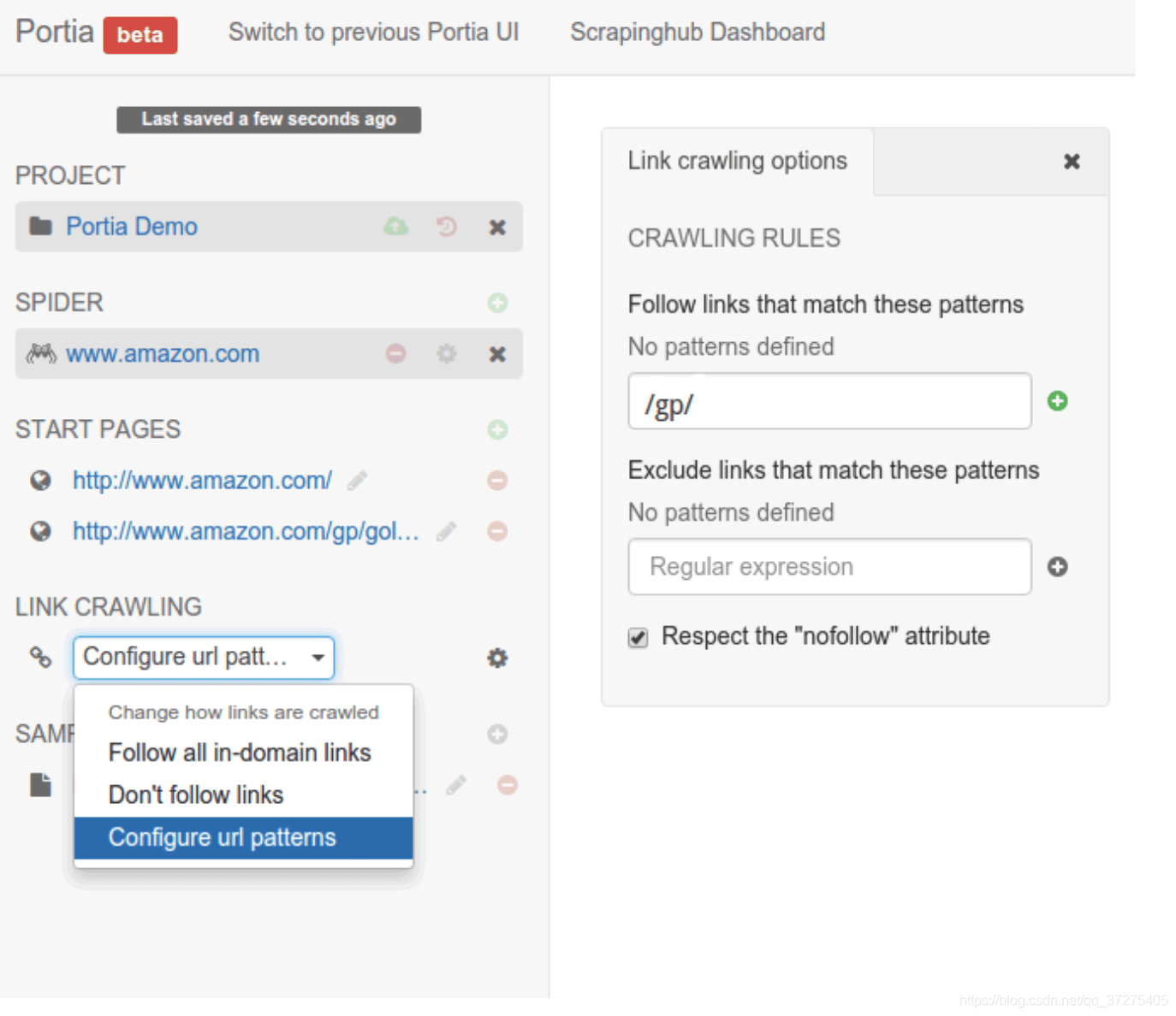 Portia默认遵循所有域内URL。在许多情况下,您需要限制Portia将访问的页面,以便不会在不相关的页面上浪费请求。
