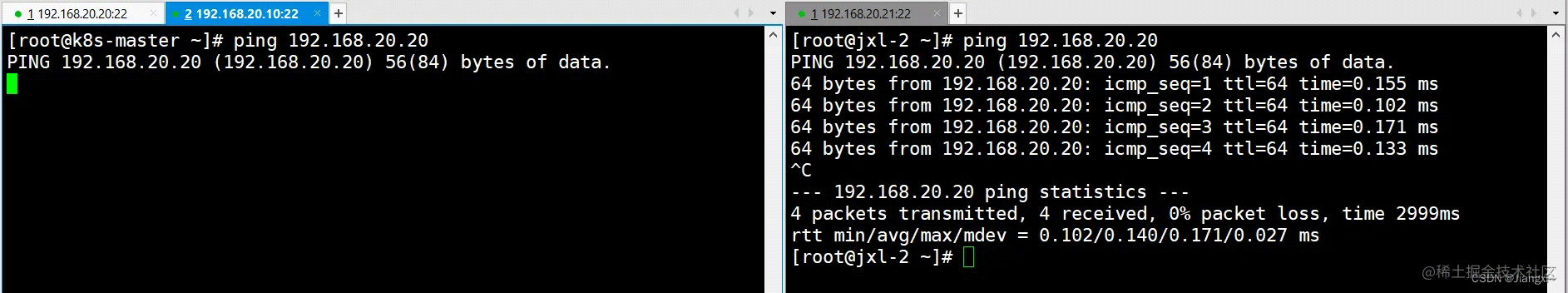 登陆192.168.20.10这个服务器中ping192.168.20.20,发现ping不通,登陆192.168.20.21这个服务器,发现能ping通192.168.20.20。