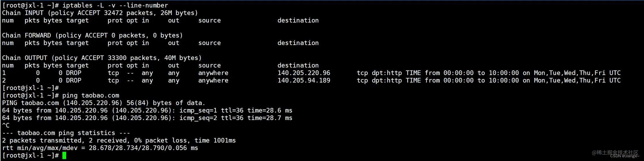 [root@jxl-1 ~]# iptables -t filter -I OUTPUT -p tcp -d taobao.com --dport 编程80 -m time --timestart 00:00 --timestop 10:00 --weekdays 1,2,3,4,5 -j DROP