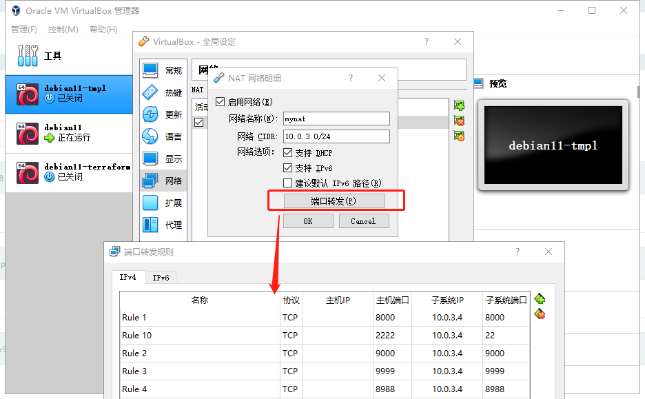 NAT网络配置之后,可以再配置端口映射,将虚拟机中的服务映射出来,可以在局域网中测试,使用。