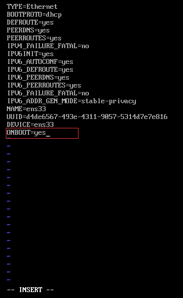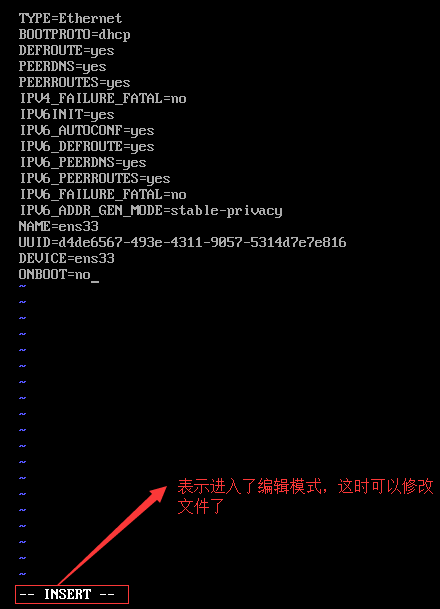 修改ONBOOT的值。按住键盘的方向键可以上下左右跳到光标的顺序。将光标移动到ONBOOT,并按一次键盘上面的“i”,表示进入编辑模式: