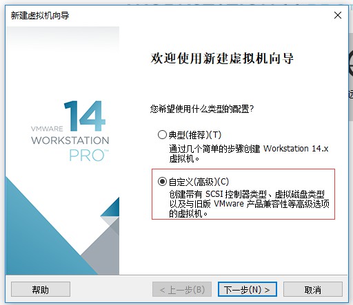 二、在选择虚拟机配置界面选择“自定义(高级)”选项,然后点击“下一步”
