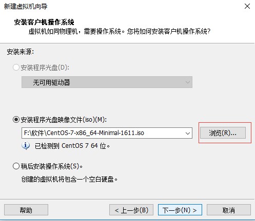 四、在安装客户机操作系统界面,选择安装程序光盘镜像文件(这里选择用iso文件进行安装)选项,该选项右侧的“浏览”按钮可以选择iso文件的存放路径,返回点击“下一步”: