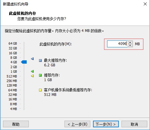 七、进入虚拟机内存配置界面,这里选择给虚拟机分配4G的内存(默认配置是1G内存),然后点击“下一步”:
