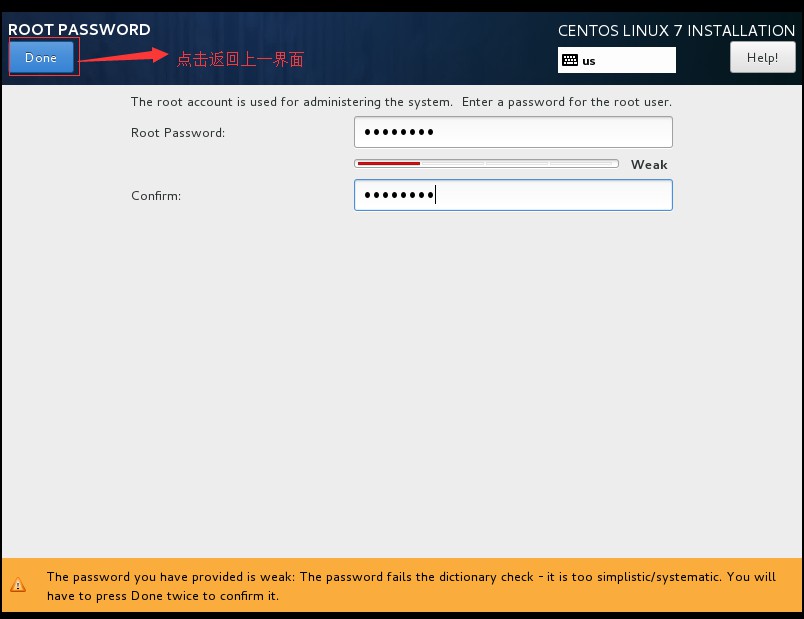 二十一、给root用户创建密码,然后点击左上角的“Done”按钮返回上一界面: