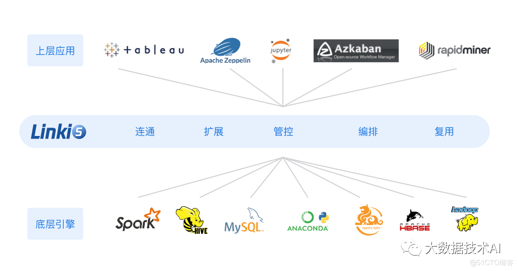 - 丰富的底层计算存储引擎支持。目前支持的计算存储引擎:Spark、Hive、Python、Presto、ElasticSearch、MLSQL、TiSpark、JDBC和Shell等。正在支持中的计算存储引擎:Flink(>=1.0.2版本已支持)、Impala等。支持的脚本语言:SparkSQL, HiveQL, Python, Shell, Pyspark, R, Scala 和JDBC 等。