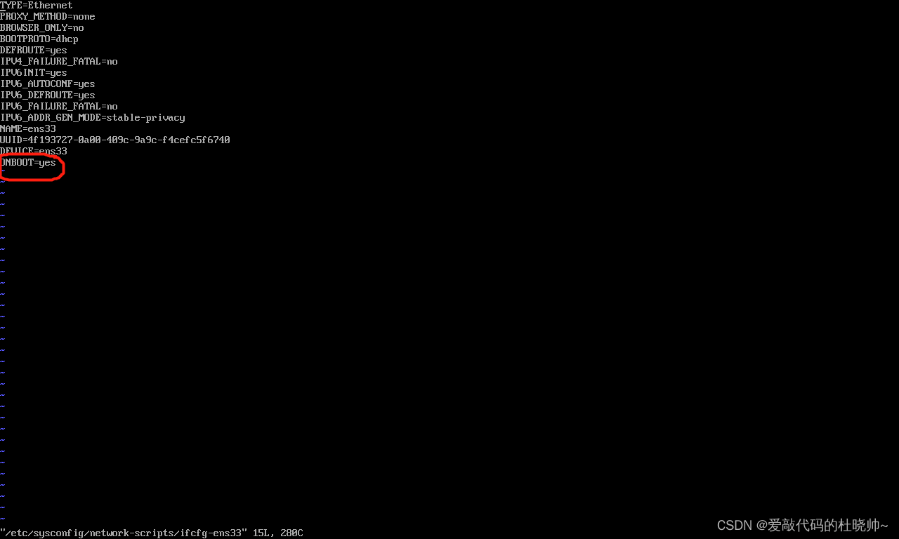 命令是:vi /etc/sysconfig/network-scripts/ifcfg-ens33