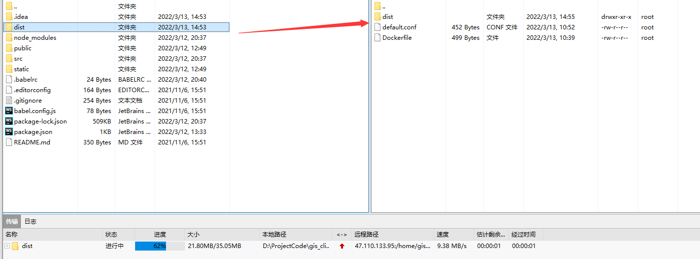 mkdir xxxx(文件名)通过Xftp将打包的dist文件上传到服务器的项目文件夹下;