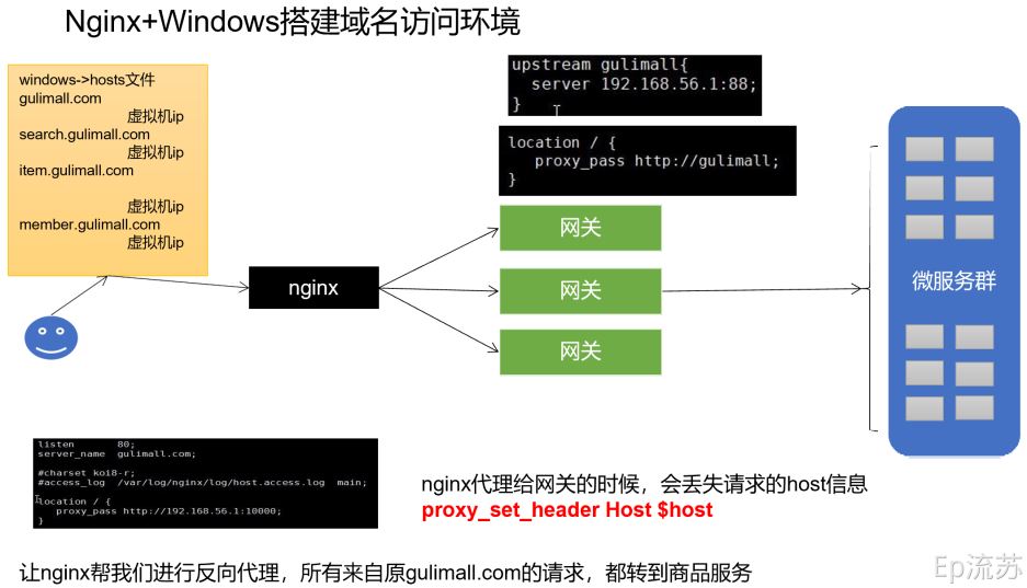192.168.163.131 gulimall.com当请求到 192.168.163.131:80 时,会被 nginx 转发到我们配置的 192.168.163.1:10000 路径,该路径为运行商品服务的 windows 主机 ip 地址,至此达到通过域名访问商品服务的目的。