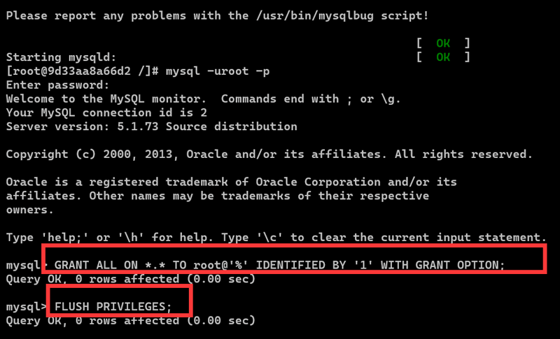 mysql -uroot -p出现绿色的ok就代表启动成功了,第一次进入MySQL没有密码,出现输入密码的提示不用理会,直接回车进入