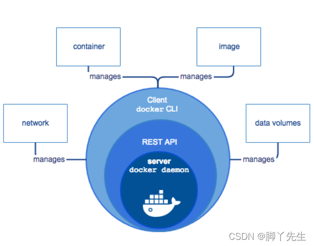 docker引擎是一个c/s结构的应用。Docker客户端只需要向Docker服务端或者守护进程发出请求,服务端或者守护进程完成所有工作返回结果主要组件见下图: