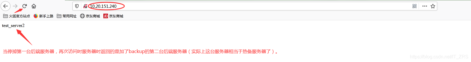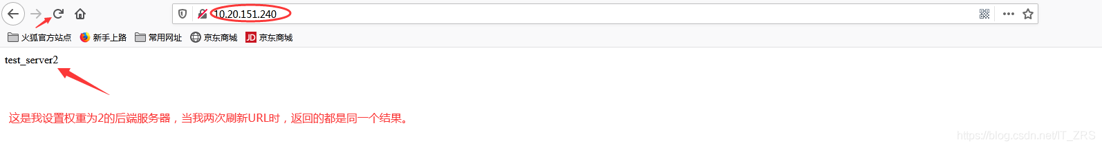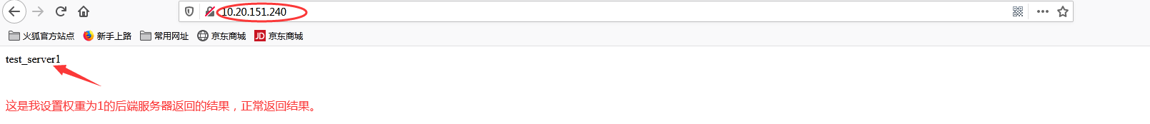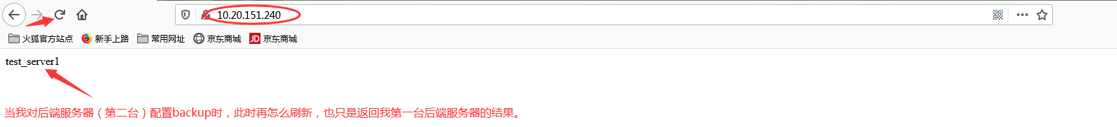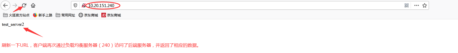 在浏览器端访问http://10.20.151.240/,在实际生产中,这两个页面返回的结果是一样的,这里是为了测试效果,所以返回了不同的内容。而为什么刷新后又会返回不同结果呢?那是因为负载均衡默认的均衡策略(或算法)是轮询,所以每刷新一次就会从不同的后端服务器返回不同的请求结果,减轻单个后端服务器的访问量,提升客户端的访问效率,从而达到负载均衡的效果。