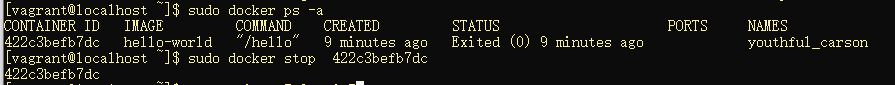 要将container 停止之后才能删除,所以要输入stop 命令,停止之后开始删除