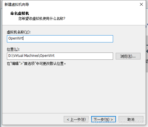 步骤6:给虚拟机命名和设置存储位置(建议起个好名,容易识别,如:openWRT)