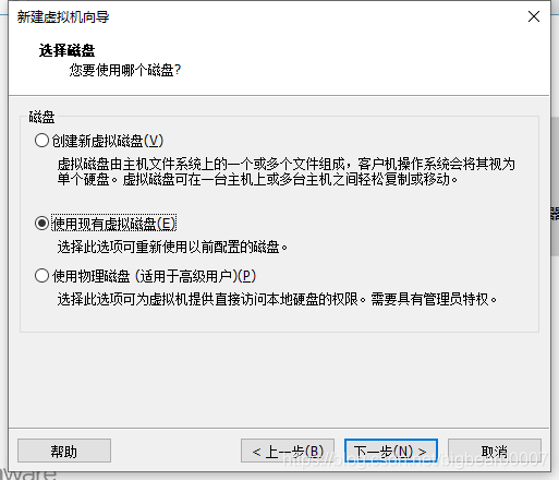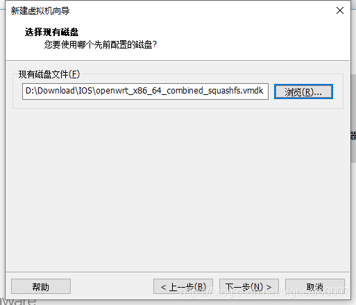 磁盘要选择 “使用现有虚拟磁盘” 并找到存放 .vmdk 固件的目录