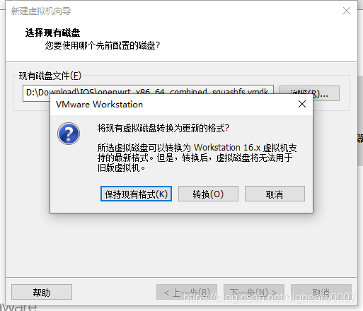 提示虚拟磁盘转换格式,选择:“保持现有格式”