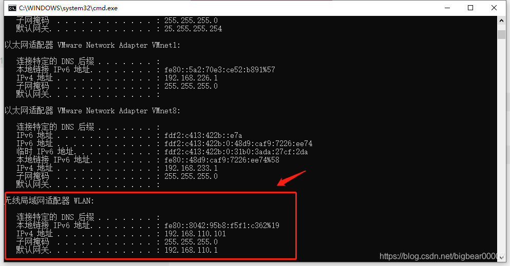ipconfig本人使用的是无线网络,找到对应的网卡,可获取本机IP、网关、子网掩码,记录起来备用