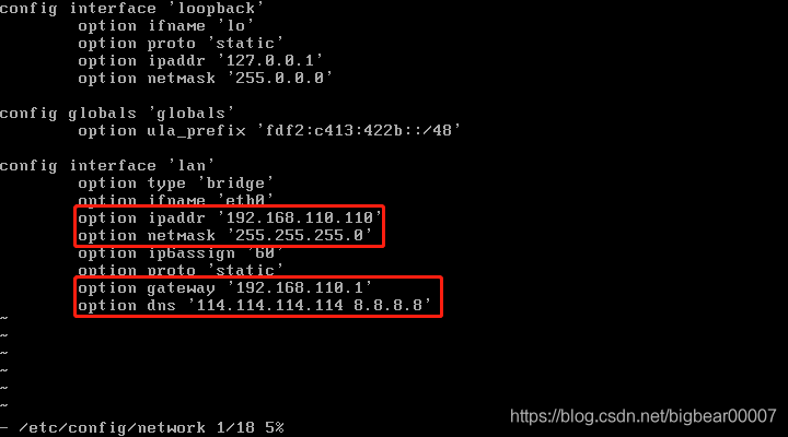 vi /etc/config/network在出现的界面中按下键盘的 i 可进行编辑,默认ip为 192.168.2.1 ,需要按照物理机的网络信息编辑。
