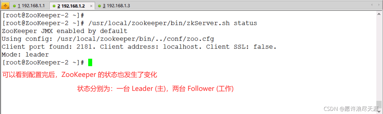 [root@ZooKeeper ~]# /usr/local/zookeeper/bin/zkServer.sh restart # 三台服务器都要重启