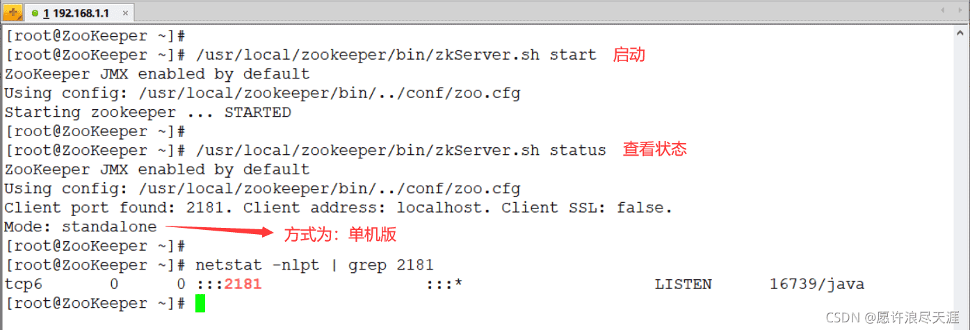[root@ZooKeeper ~]# /usr/local/zookeeper/bin/zkServer.sh start # 启动