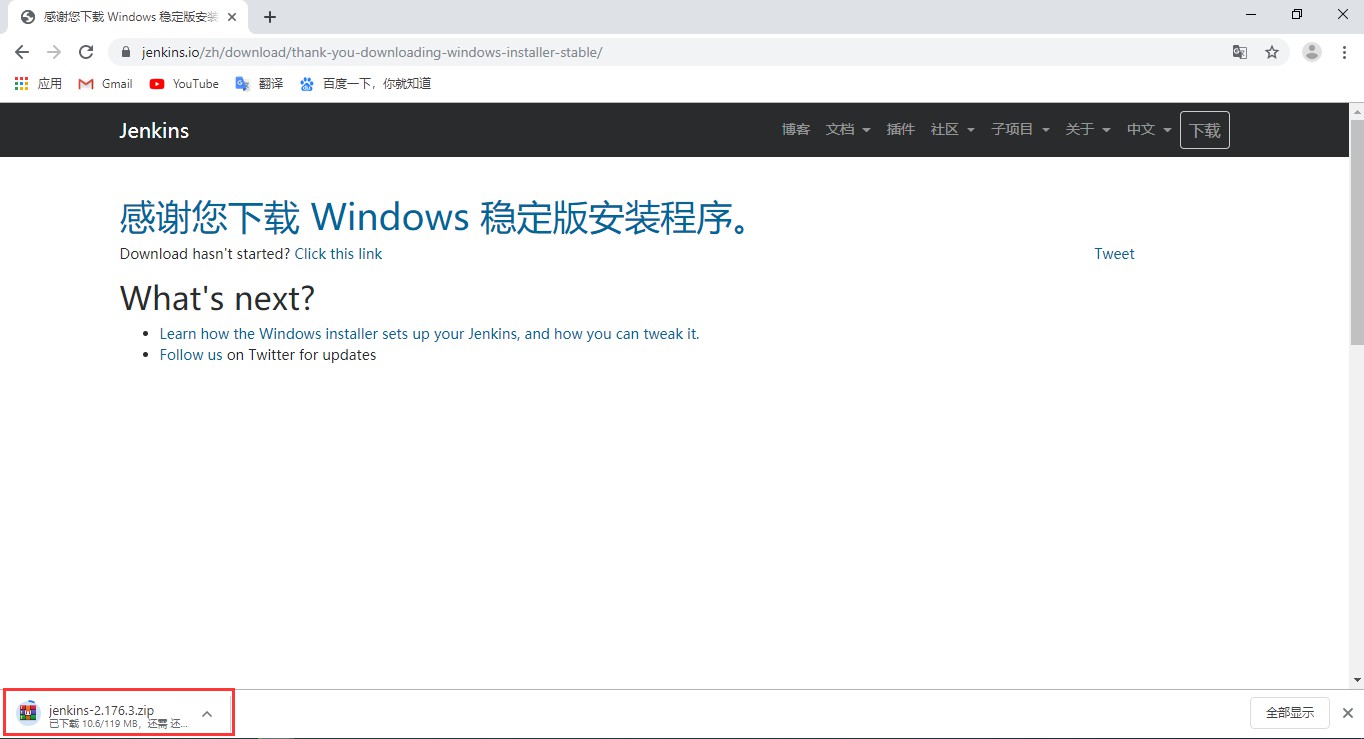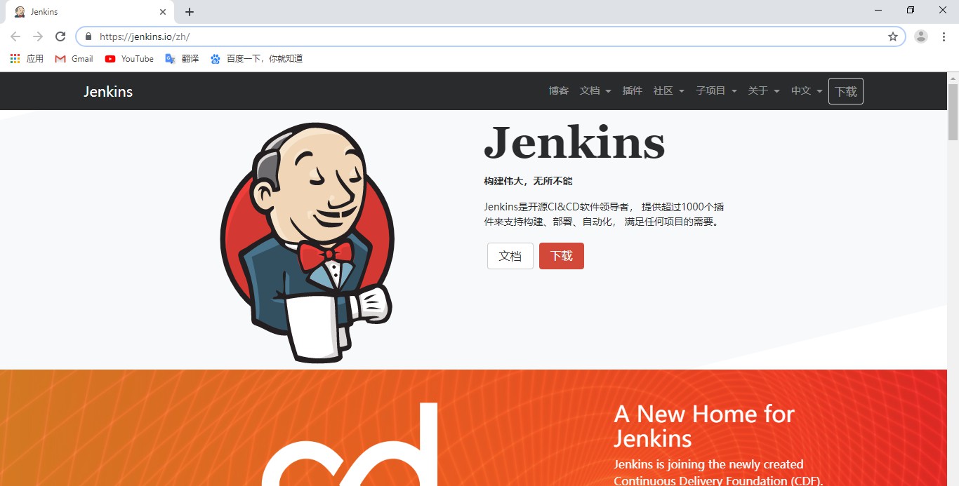 安装Jenkins之前首先去Jenkins官网下载安装文件,Jenkins官网:https://jenkins.io/zh/