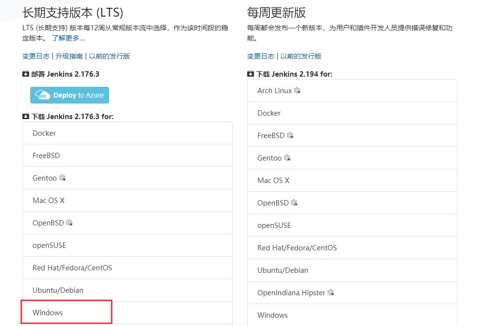 如图所示。Jenkins分为两个版本:长期支持版和每周更新版,这里选择长期支持版下载,点击“下载”会加载下载页面