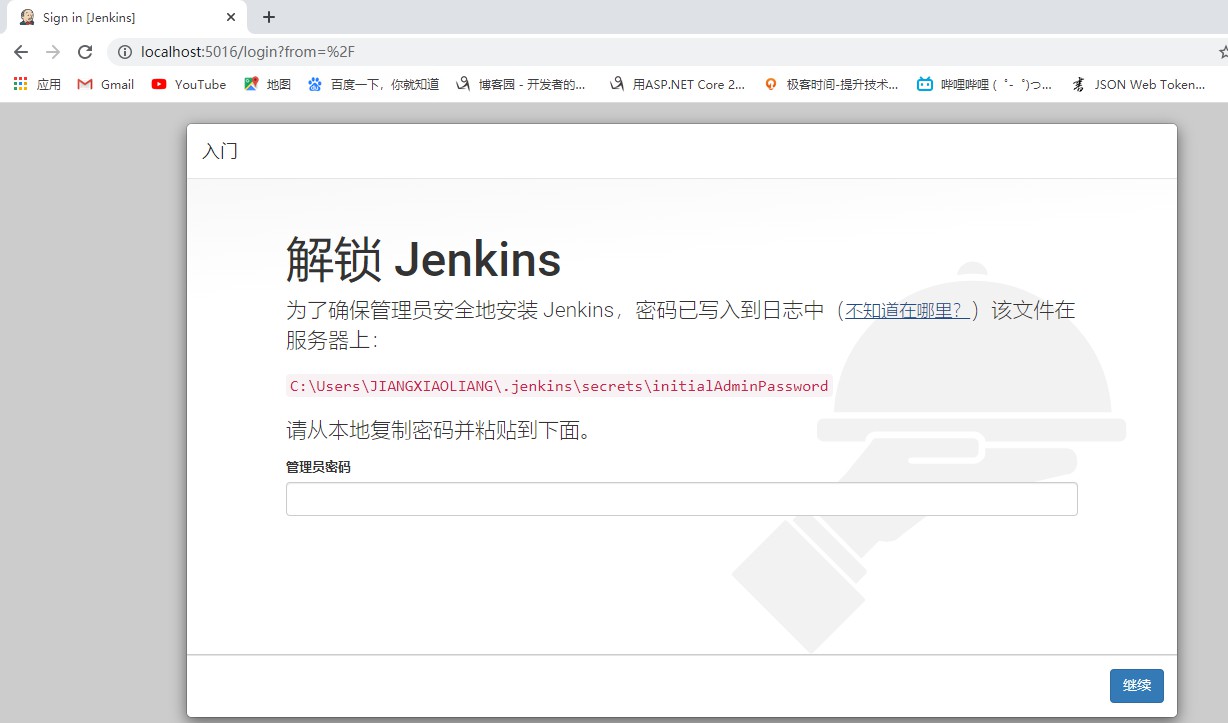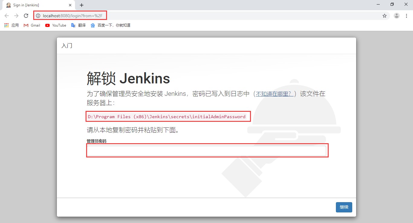 点击“Finish”按钮,浏览器会自动打开Jenkins默认的端口进行浏览,第一次登陆Jenkins的时候需要先进行解锁,按照路径提示找到密码,可以使用任何文本编辑工具打开该文件,然后输入管理吗密码解锁: