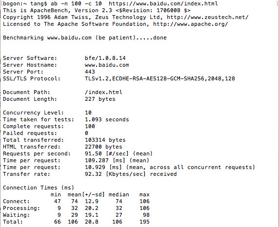 测试命令:ab -n 100 -c 10 https://www.baidu.com/index.html