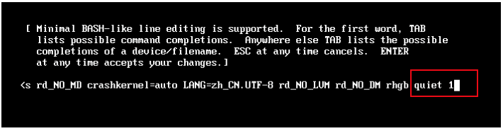 在默认quiet后,输入空格1,这个空格一定要输入,如果不输入该空格,最后的结尾为quiet1,quiet1是一个错误单词,系统无法识别,不能正常运行。输入的这个1表示系统运行级别,级别1为单用户模式。