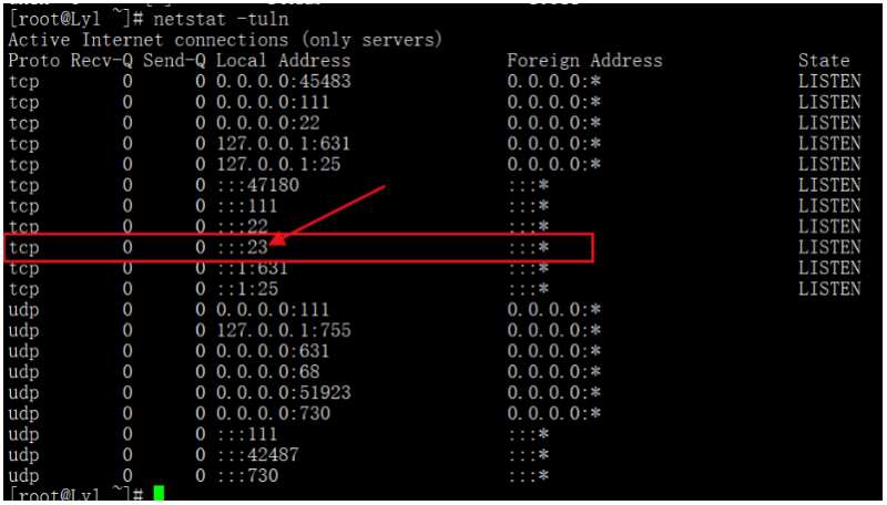 我们使用telnet服务来举例,telnet服务是用来进程系统远程管理的,端口是23。不过需要注意的是telnet的远程管理数据在网络当中是明文传输,非常不安全,所以我们在生产服务器上是不建议启动telnet服务的(telnet服务的server端不安全),我们这里只是举例而已,用完就删除即可。在生产服务器上,远程管理使用的是ssh协议,ssh是加密的更加安全。