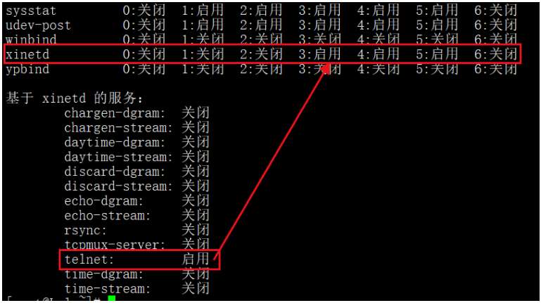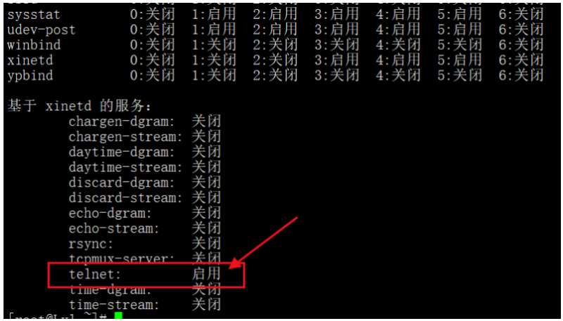 使用chkconfig --list查看telnet服务的自启动状态,如下图所示: