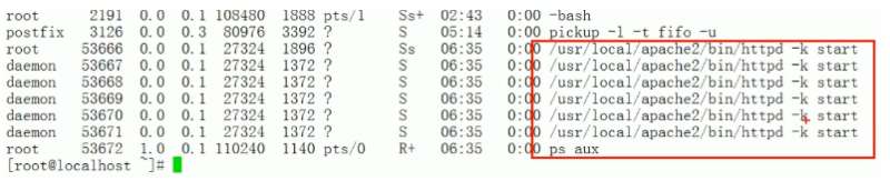 查看apache服务是否开启,执行命令ps aux | grep httpd 。