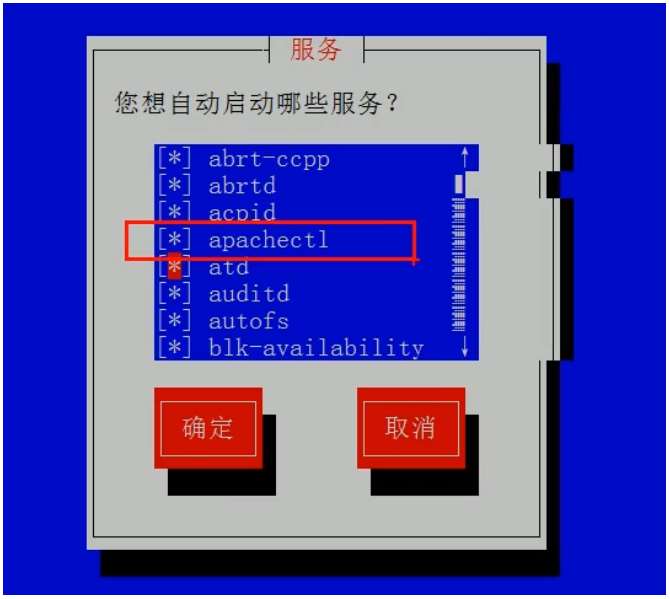 执行[root@localhost ~]# ntsysv命令,可以在图形界面中找到我们上边刚刚配置的apache服务。